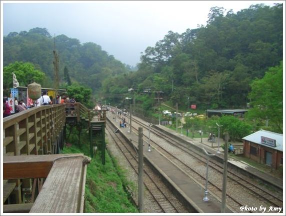 在一ㄚ箱寶拿到彩繪完成品後,外頭熾熱的陽光不見了,問好下一景點「勝興車站」怎麼走,即騎車前往,延山路而行人煙越來越稀少,車輛卻是多且皆往同一方向,來到勝興車站的路上已開始塞車,好不容易找到一停車位,看見四處皆是人潮,媽媽找一處坐下,我即步行至火車站前,或許是因假日的原故,遊客將小小的車站前後擠滿,也因車站前舉辦搭乘電動小火車活動,因而排隊人潮眾多,鐵道旁半山腰餐廳也己坐滿遊客。