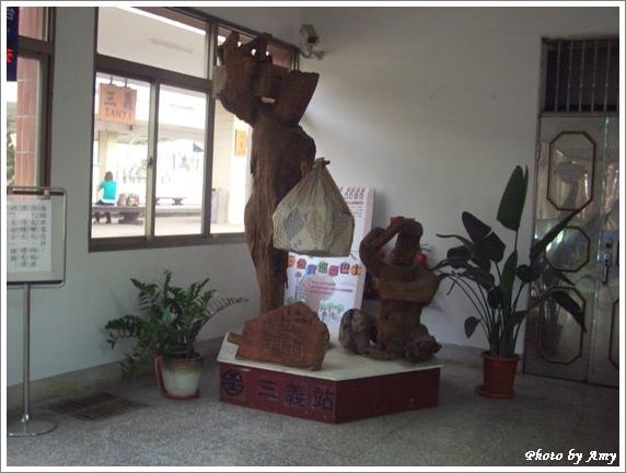 早上坐八點十分的火車至苗栗,再換區間車至三義,全程只需一小時又四十五分車程,一踏進三義火車站,即看到木雕品樹立在剪票口處,接著在大廳出入口處看到一塊木雕上面刻著三義地圖,真不愧是木雕之鄉,連火車站都有木雕品。
